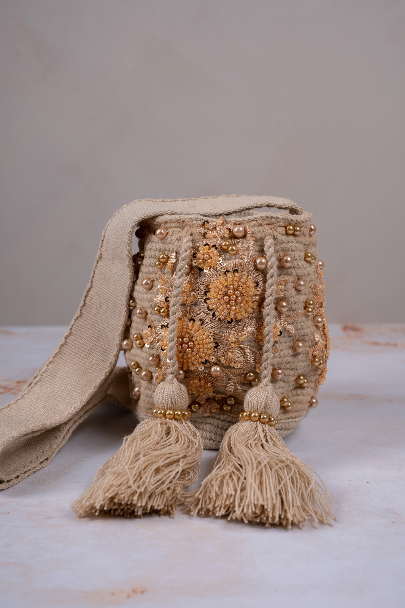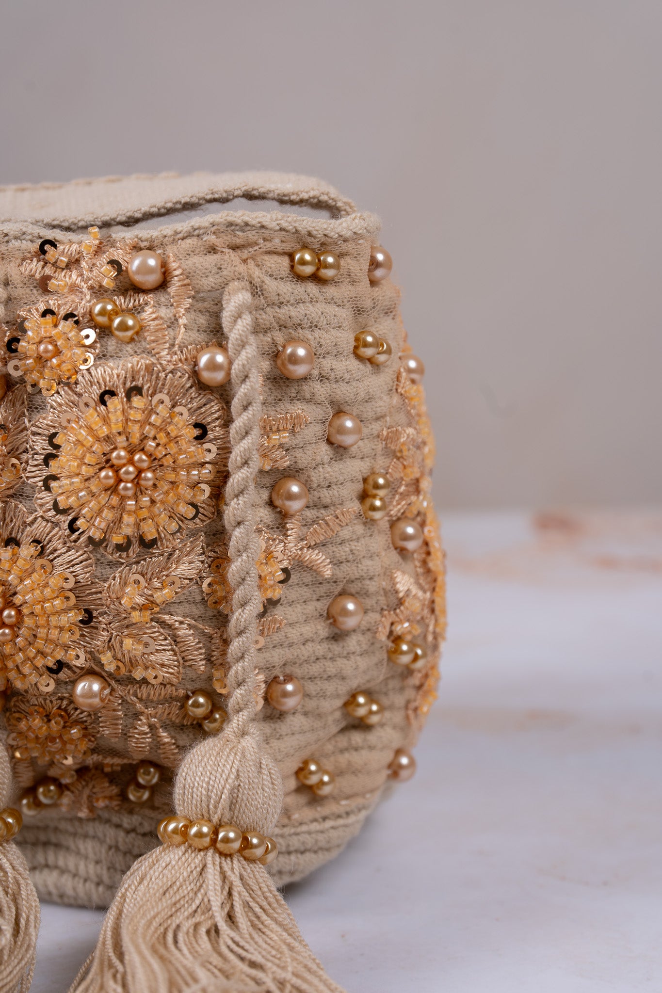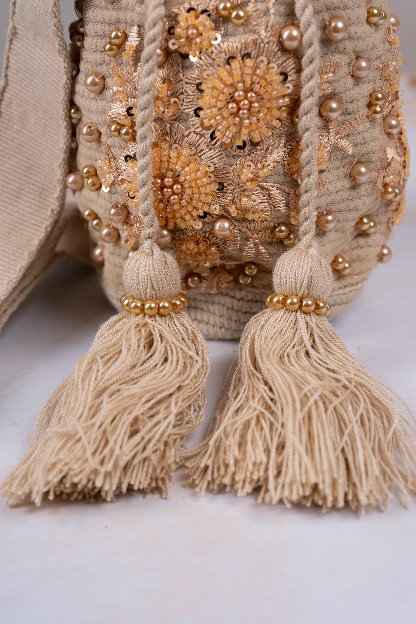 •Material: Base en hilo de algodón sintético, tela recamadas con pedrería y perlas de vidrio.
